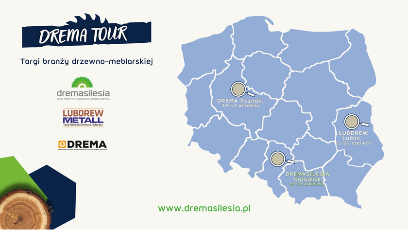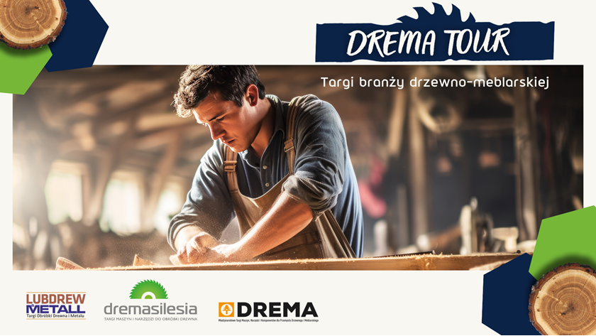 DREMA Tour to największy i najważniejszy cykl wydarzeń dedykowanych branży drzewno-meblarskiej w Polsce, wspierany przez liderów rynku: firmy z sektora obróbki drewna i producentów mebli, jak również kluczowe stowarzyszenia i media branżowe. DREMA Tour 2024 odbywać się będzie w trzech miastach: w Lublinie (targi LUBDREW), Katowicach (targi DREMASILESIA) oraz w Poznaniu (targi DREMA).